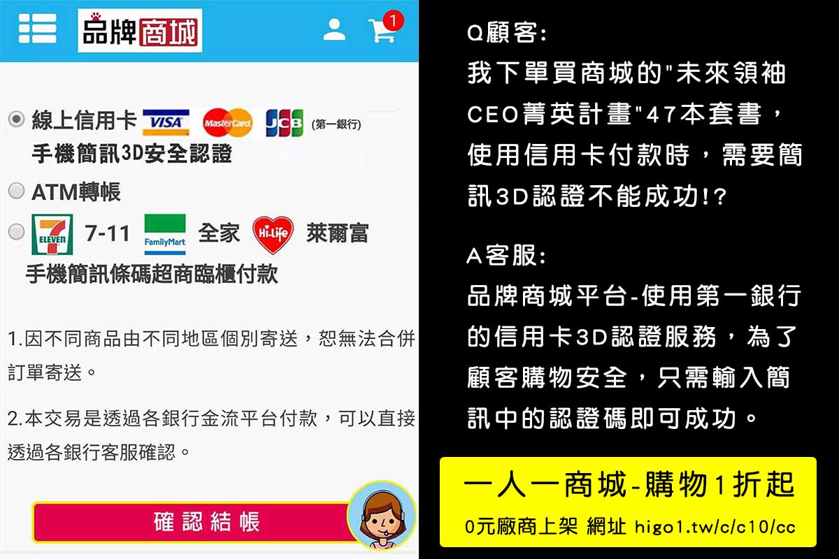 我下單買商城的"未來領袖CEO菁英計畫"47本套書,使用信用卡付款時,需要簡訊3D認證不能成功!?