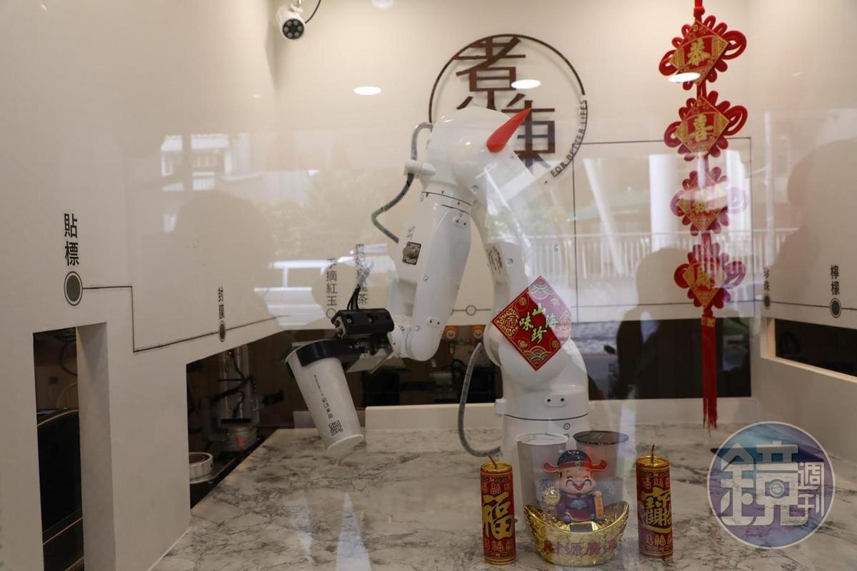 逢甲夜市的「煑東自動化茶飲」,「煑東」來自於台語的自動2字。入店可以看見全白的機械手臂跟客人揮手打招呼,靈活姿態有夠可愛。不少人走入店內,是先研究機器人半天,才開始研究菜單的。
