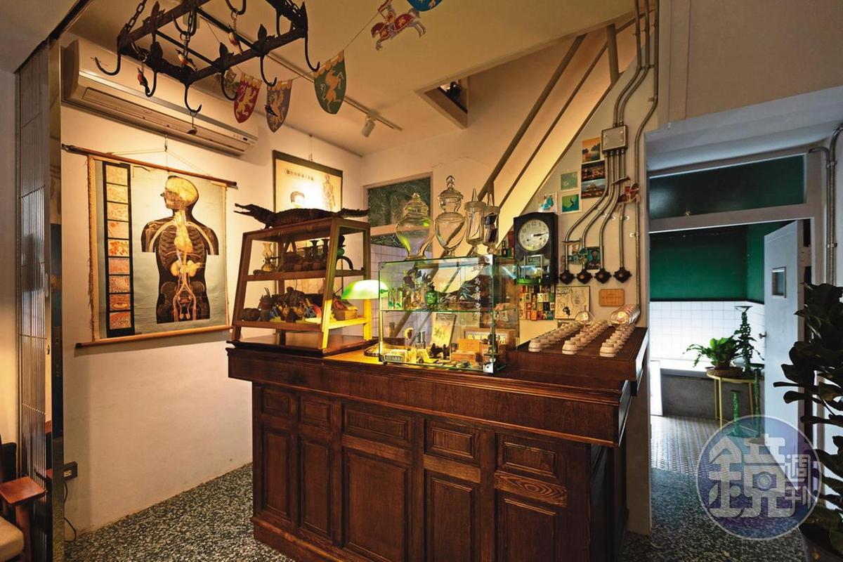 走進「島東譯電所」,牆上的西醫解剖圖、桌上的中醫穴道人體模型、櫃子裡近百年的手搖音樂盒、鱷魚和貓頭鷹標本,都是令人新奇的玩意,這裡是選物店、藝術空間,也是間提供客家點心及調酒的小酒吧。