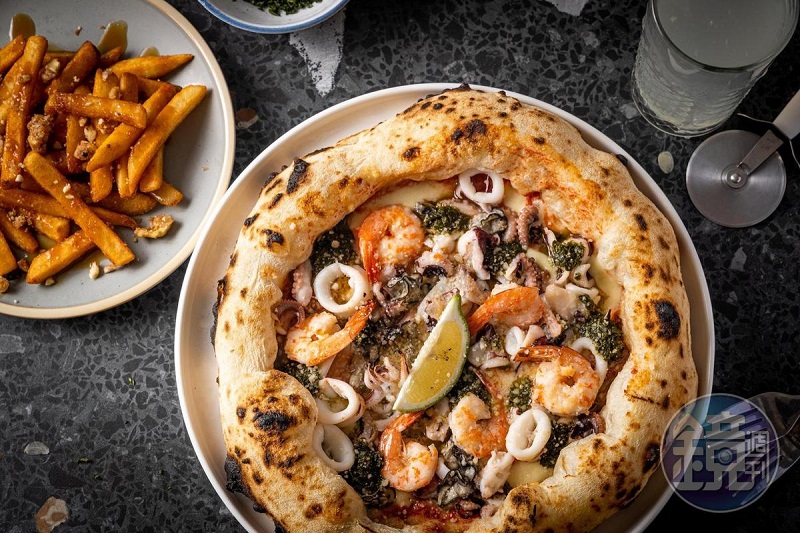 「Mercato Pizza」主打拿波里如今最紅的「雲朵披薩」,披薩邊緣餅皮膨起,咬下充滿空氣感,外圍脆、軟、香等口感卻同時出現。招牌的「漁市場披薩」使用紅醬為底,上頭有蝦子、小管、石鮔和石蚵,淋上青醬和莫札瑞拉起司,最後擠上檸檬汁,是款充滿清香氣息的海鮮料理。「章魚燒披薩」則使用大量小管和石鮔,以照燒美乃滋營造出獨特的醇厚滋味。