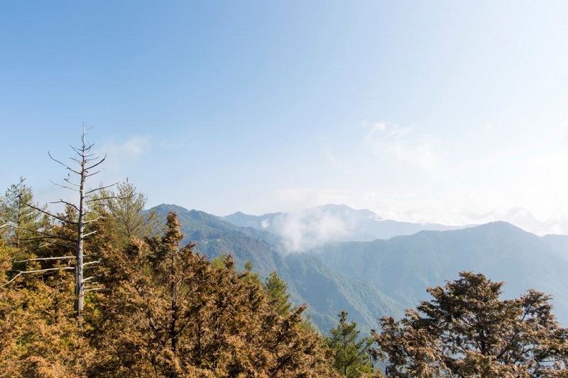 前往觀景台途中,往大雪山林道另一側的鞍馬山稜線望去,筆直而灰白的冷杉昂然佇立在山麓的高位上,搭配著墨綠蒼勁的鐵杉間雜在其中,邊坡上則為檜木、二葉松和華山松等,加上林下的箭竹草坡,層次對比鮮明的顏色添綴著這座山色,真是教人流連忘返!