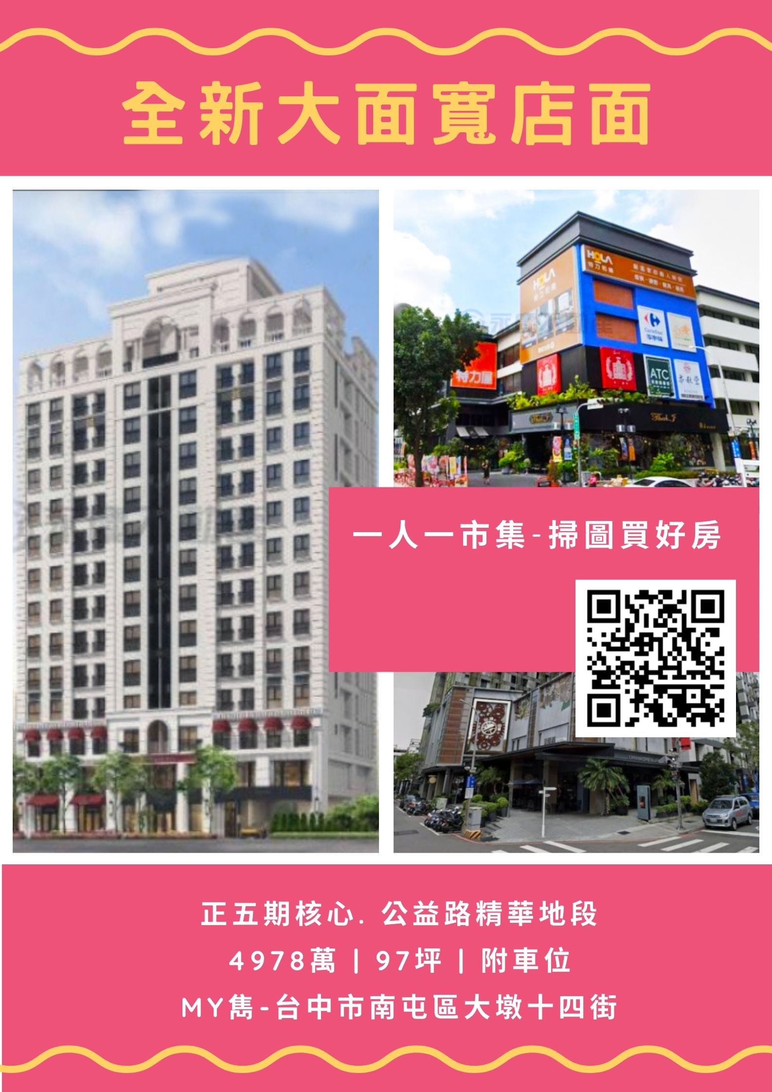 1.正五期核心地段,公益路精華地段 2.店面位置位於大墩14街VS大墩路 3.緊鄰7期高級生活圈 4.附近高知名商家林立 5.大面寬1-2樓店面,面寬5.7米,深度16米 7.單樓層平面室內28坪