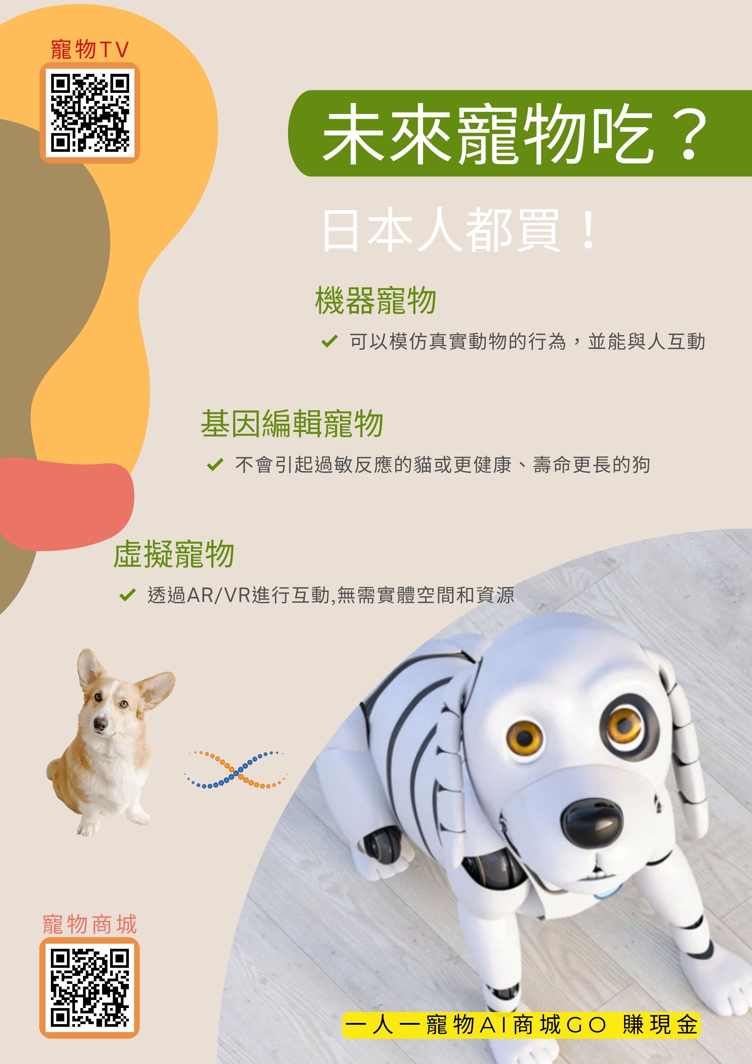 1. 機器寵物:隨著人工智能和機器人技術的進步,機器寵物將變得越來越真實和智能。這些機器寵物可以模仿真實動物的行為,並能與人互動,為那些過敏或不便養真實寵物的人提供一個替代方案。