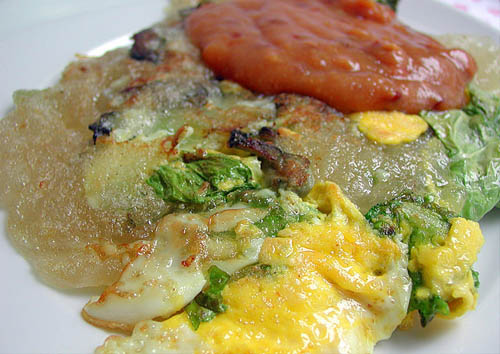 2. 熱鍋後,開始煎蚵仔,煎至半熟後加入剛調的粉漿