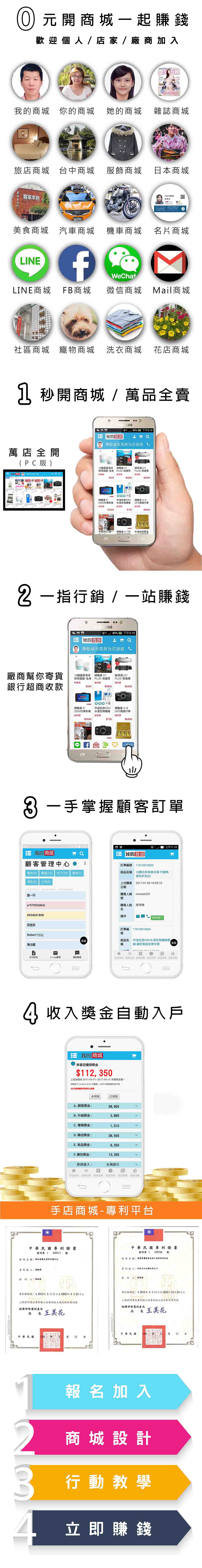 你的多媒體手店商城,線上線下、萬店全開、萬品全賣、廠商寄貨、超商收款、自動結算、錢入戶頭。 FB / LINE / 微信 / 簡訊 / Mail / 店家到處行銷賺錢 - 立馬加入 (如需商城設計服務及名片DM印刷費只要3600元/年-手店專員為您服務)