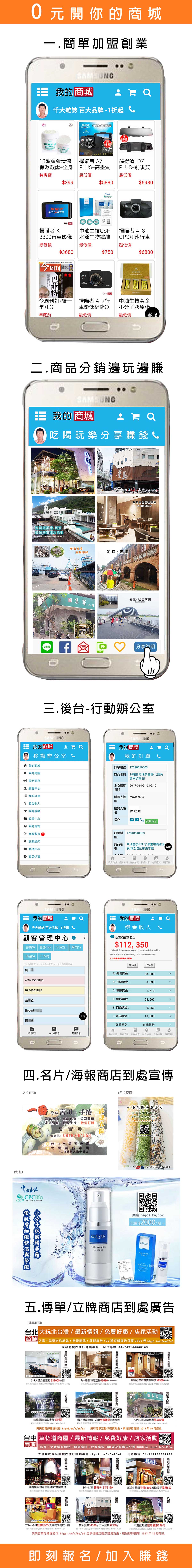 萬店全開、萬品全賣、廠商寄貨、超商收款。把生活的吃喝玩樂用 FB / LINE / 微信 / 簡訊 / E-Mail /海報/傳單/名片 連結商城裡所有商店及商品,到處分享 行銷賺錢 - 即刻加入 ! 1. 試用版0元 & 2.客製版3600元 ( 含商城設計服務及名片10/盒、傳單500/張、海報10/張 )
